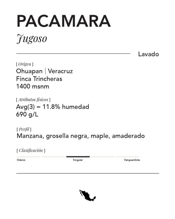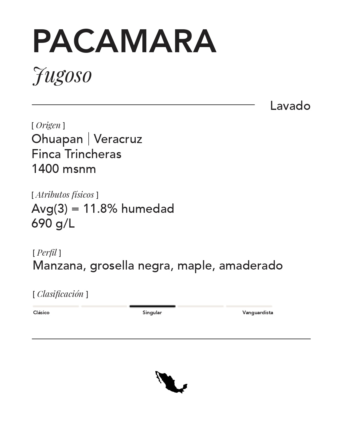 - Este Pacamara Lavado tiene un perfil frutal con acidez málica, lo que resulta en una taza jugosa y brillante. Ofrece notas dulces complejas de manzana, grosella negra y canela, con matices acaramelados y amaderados de miel de maple, y un resabio sedoso de mantequilla fresca.